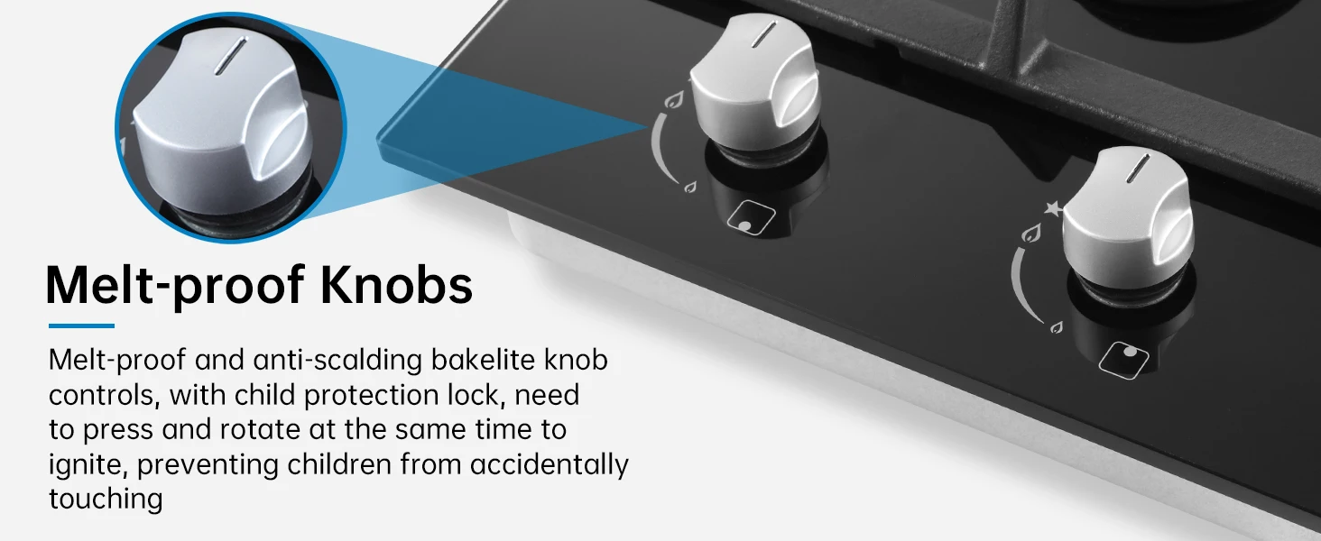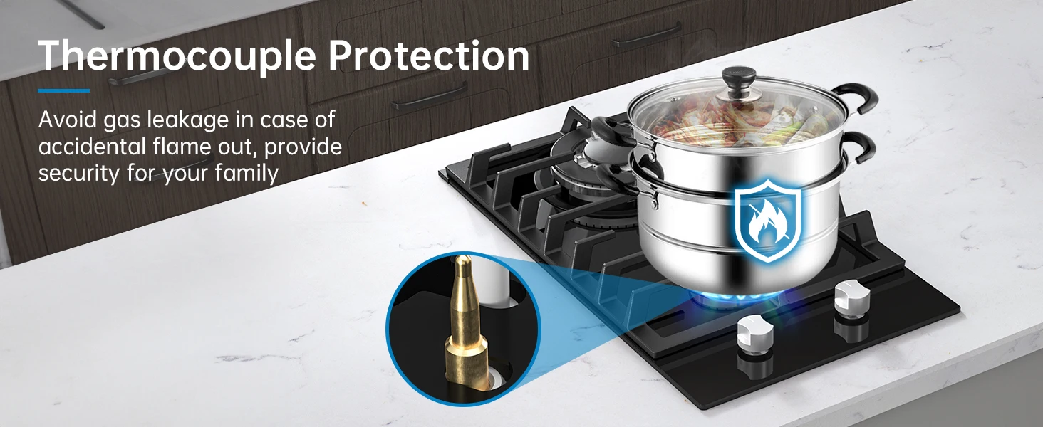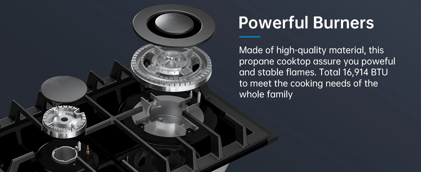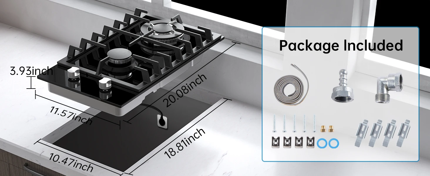 Crafted with heavy-duty cast iron grates, our built-in propane gas stove is stable and will not deform. Its compact design makes it perfect for small counters or apartment, RV, indoor use, without compromising on performance. With dimensions of stovetop size:11.57" W x 20.08"D x 3.93"H and a cut-out size of 10.47" W x 18.81'D. NOTE: Please install the burner cap according to the instructions, otherwise it will cause the glass to break.