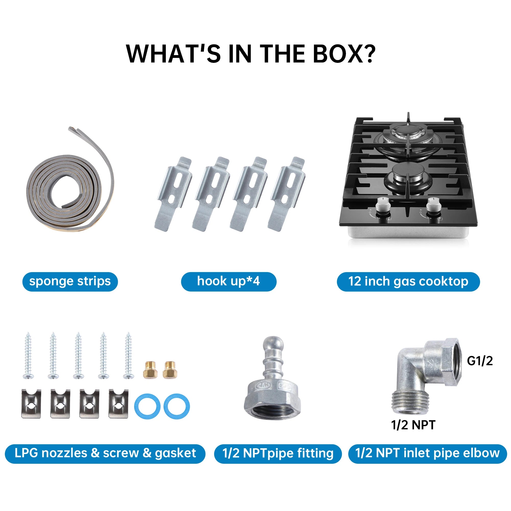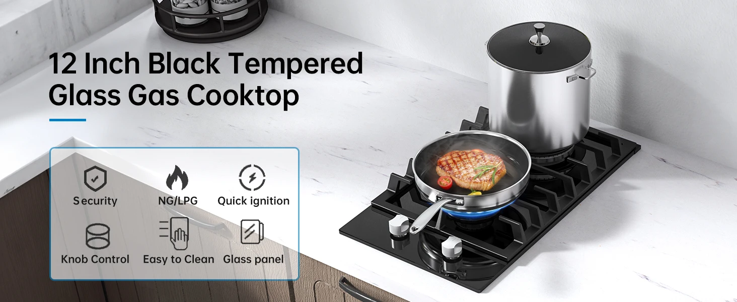 Built with black tempered glass surface, this 12" propane cooktop not only exudes elegance but also resists stain, heat and discoloration. 2 sealed burners prevent food from dropping into them. You can simply remove the grates and wipe it clean with water or detergent.