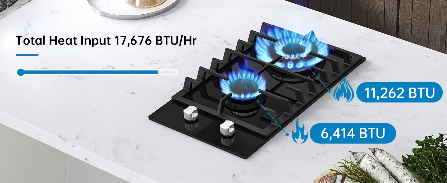 This drop in 12 inch gas cooktop features 2 highly efficient sealed burners. 11,262 BTU rapid burner for boiling, searing, pan frying. And 6,414 BTU simmer burners provide consistent and accurate low heat for delicate cuisines.