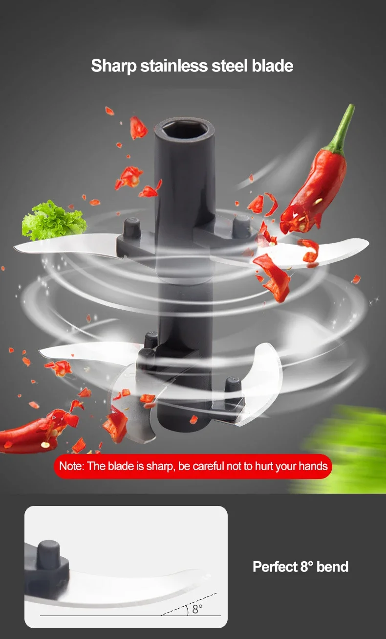 - Efficiently cuts and crushes garlic, nuts, vegetables, and meats.