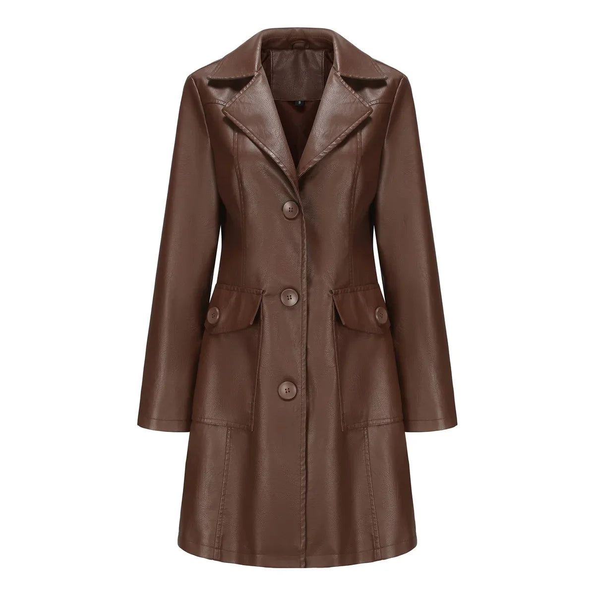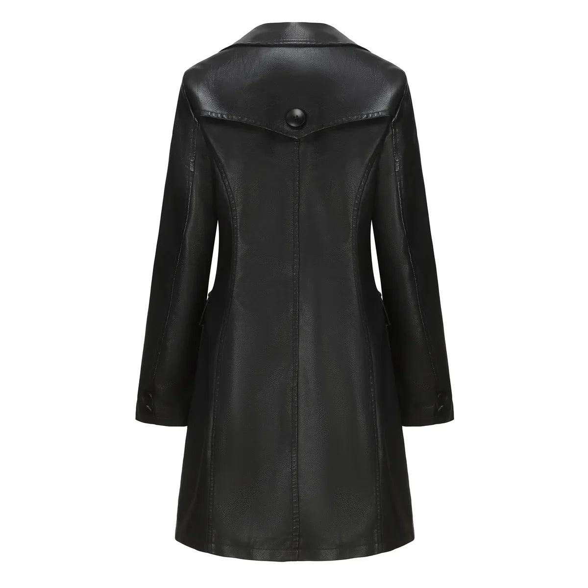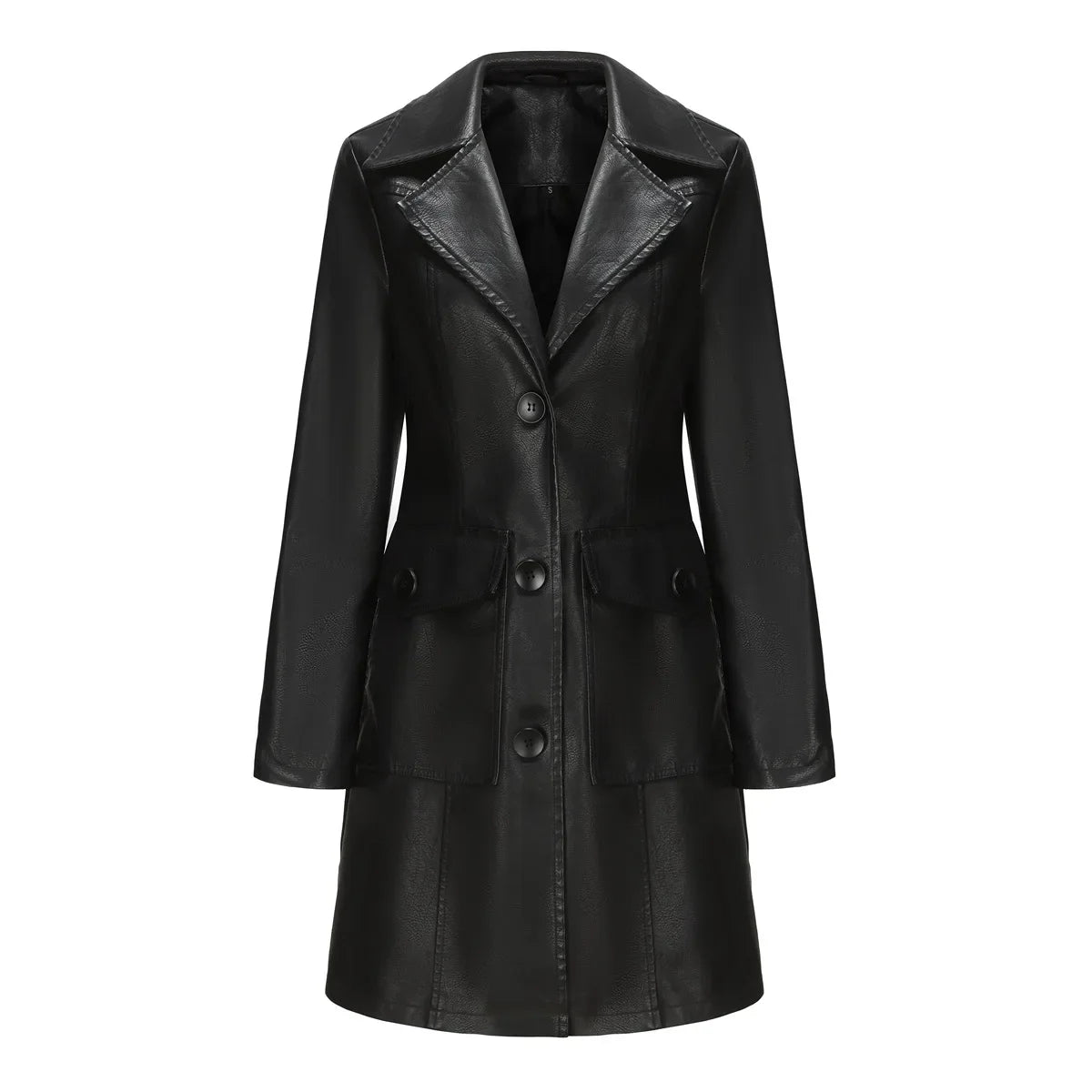 Black Women Long Leather Jacket, Spring and Autumn Long-sleeved PU Windbreaker Jacket Fashion Female Lapel Single-breasted Tops