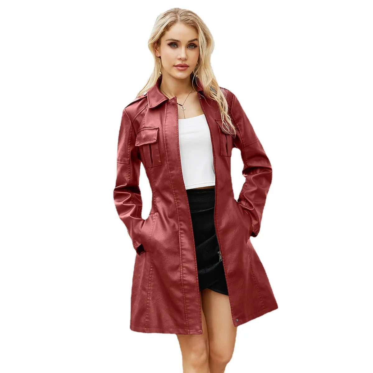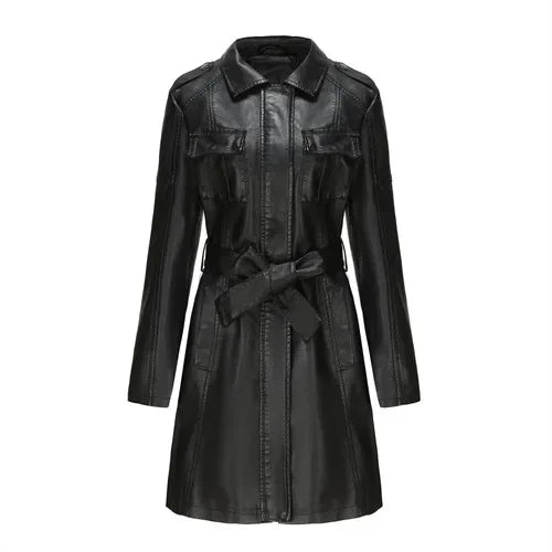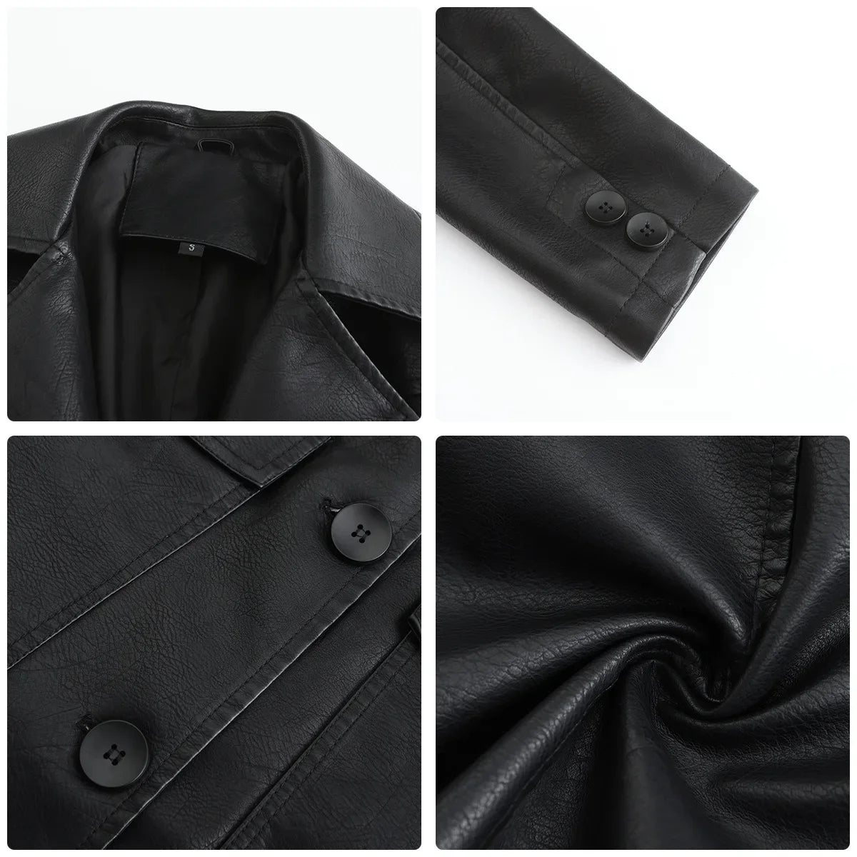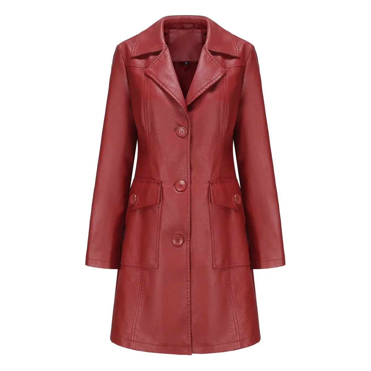 Black Women Long Leather Jacket, Spring and Autumn Long-sleeved PU Windbreaker Jacket Fashion Female Lapel Single-breasted Tops