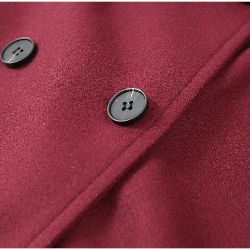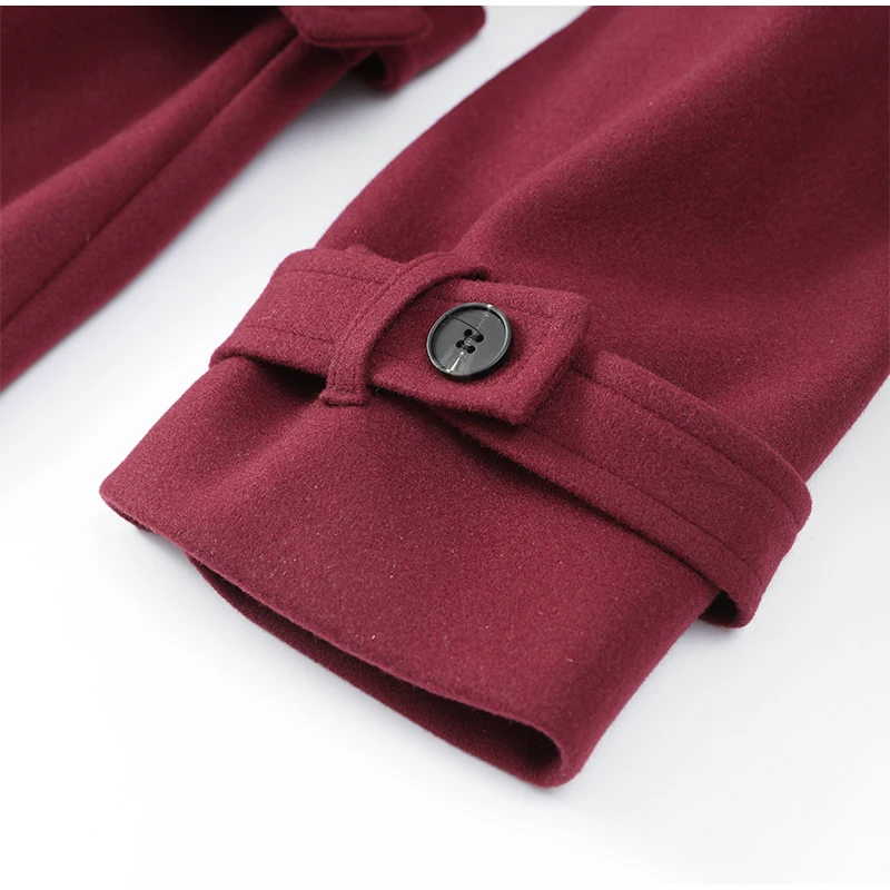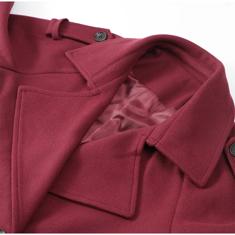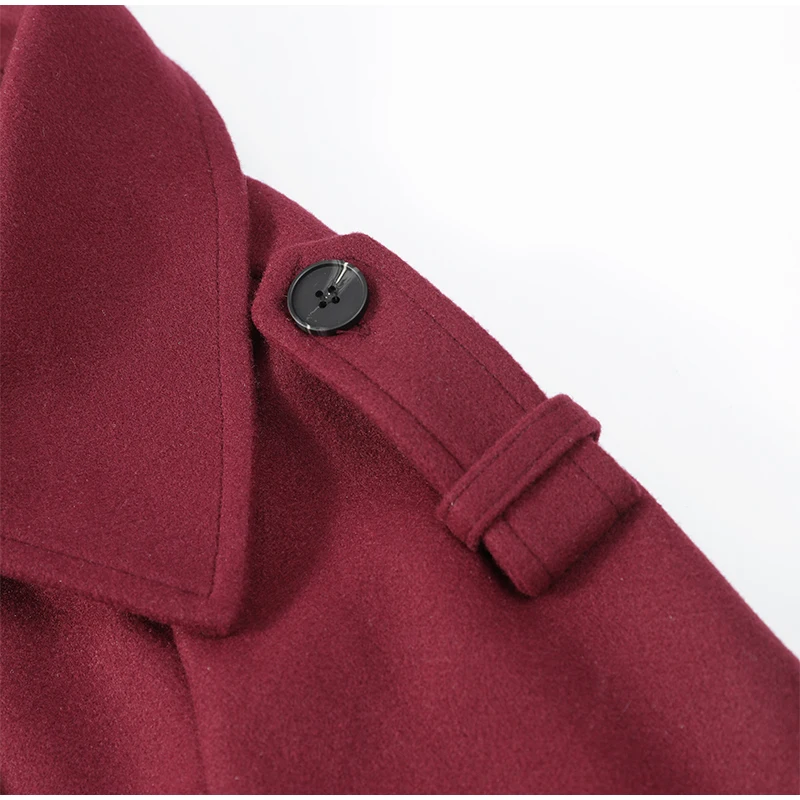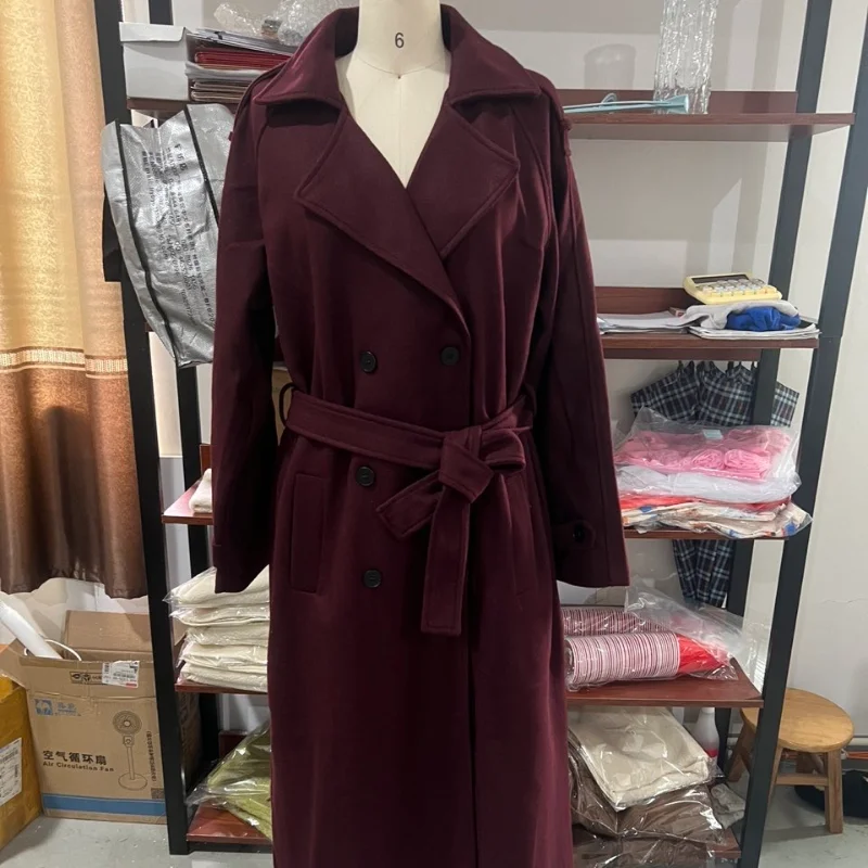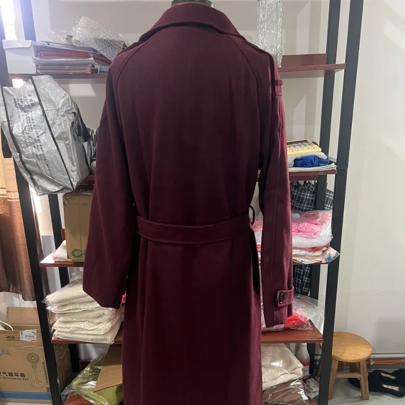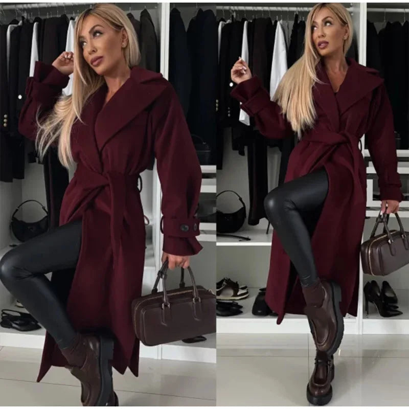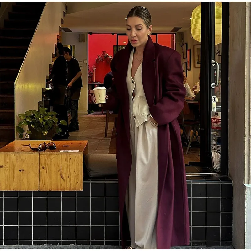 Elegant Burgundy Woolen Overcoat With Belt For Women Long Sleeve Lapel Loose Long Trench 2024 Autumn High Street New Lady Coats