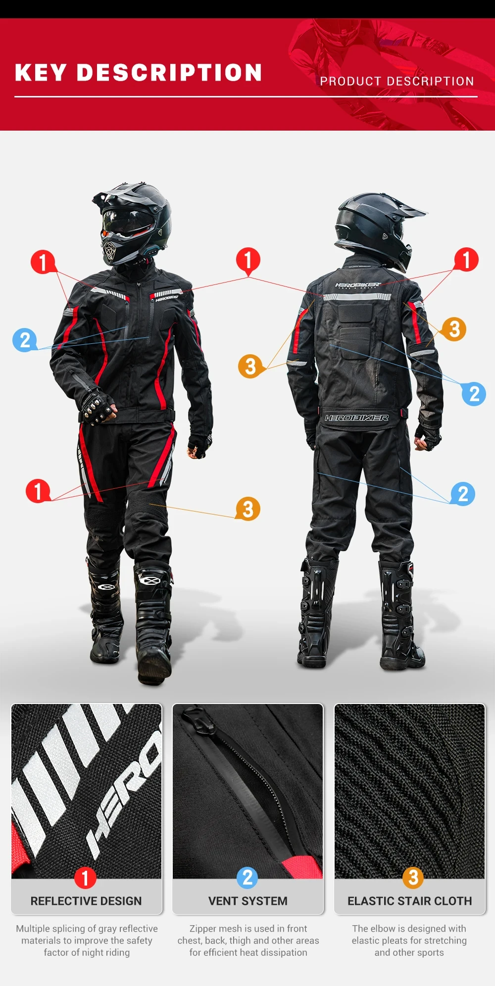 Folds design on the elbows and back, conform natural curvature, riding comfortable