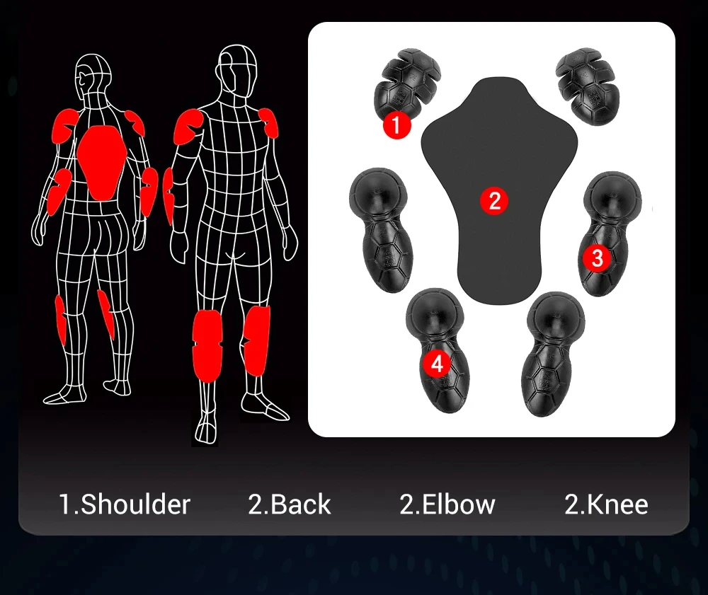 Protectors: Shoulder, Elbow, Back (Neck protection need to purchase separately)