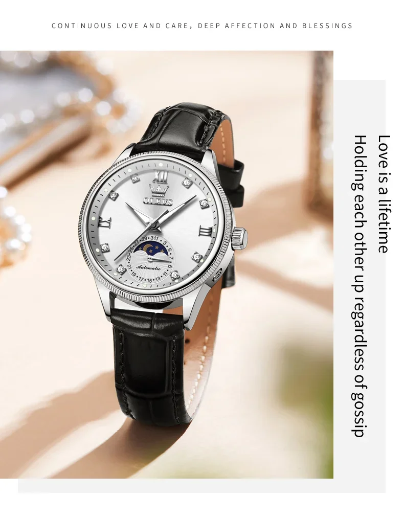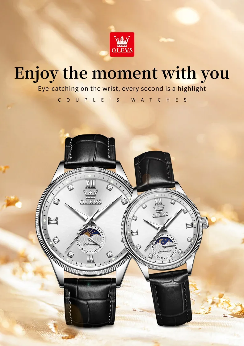OLEVS Business Diamond Mechanical Couple Watch For Men Women Date Moon Phase Hand Clock Waterproof Luxury Automatic Watches 7039
