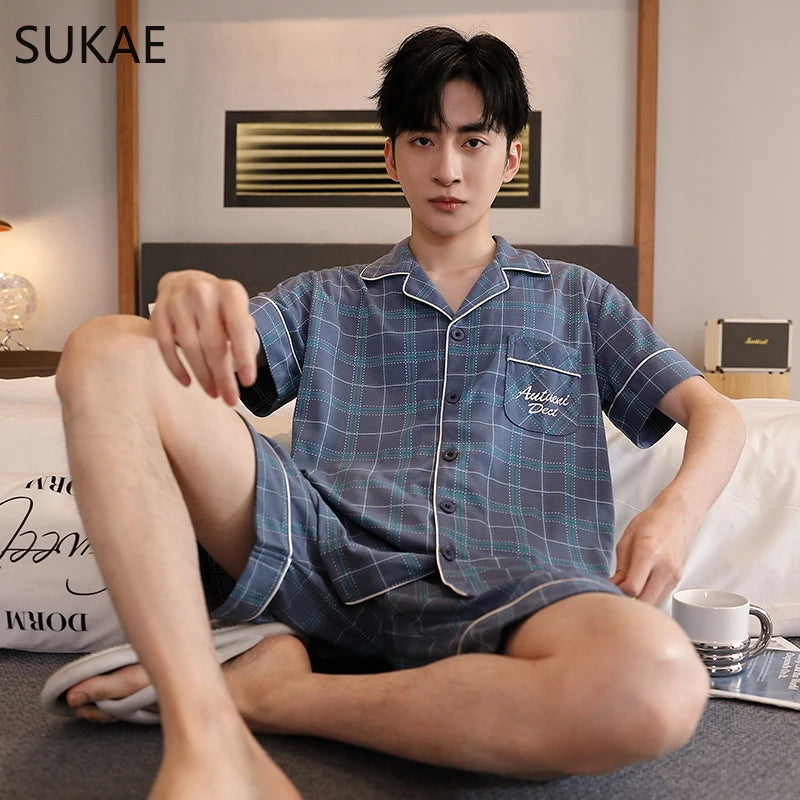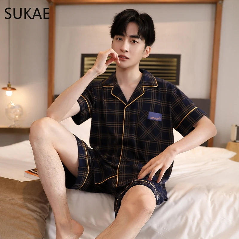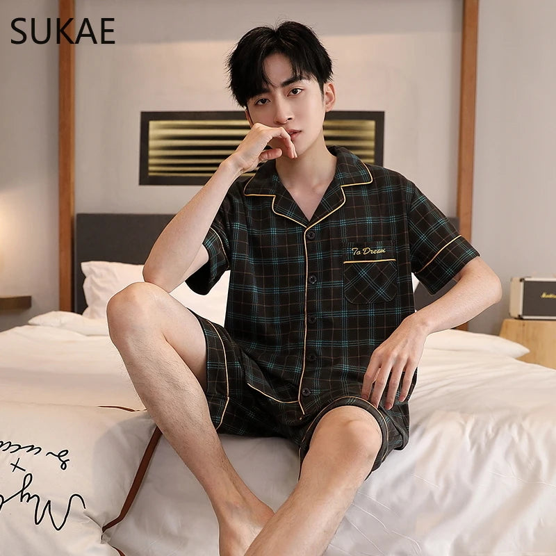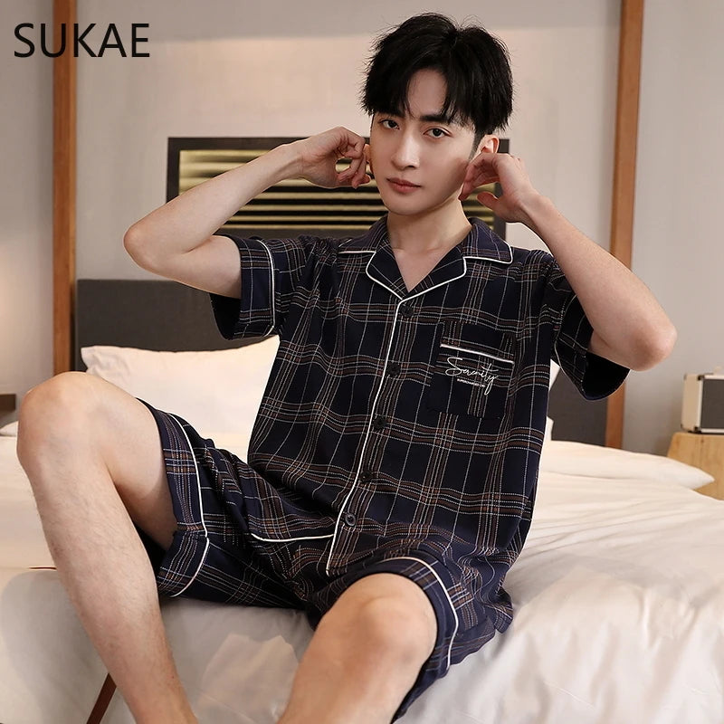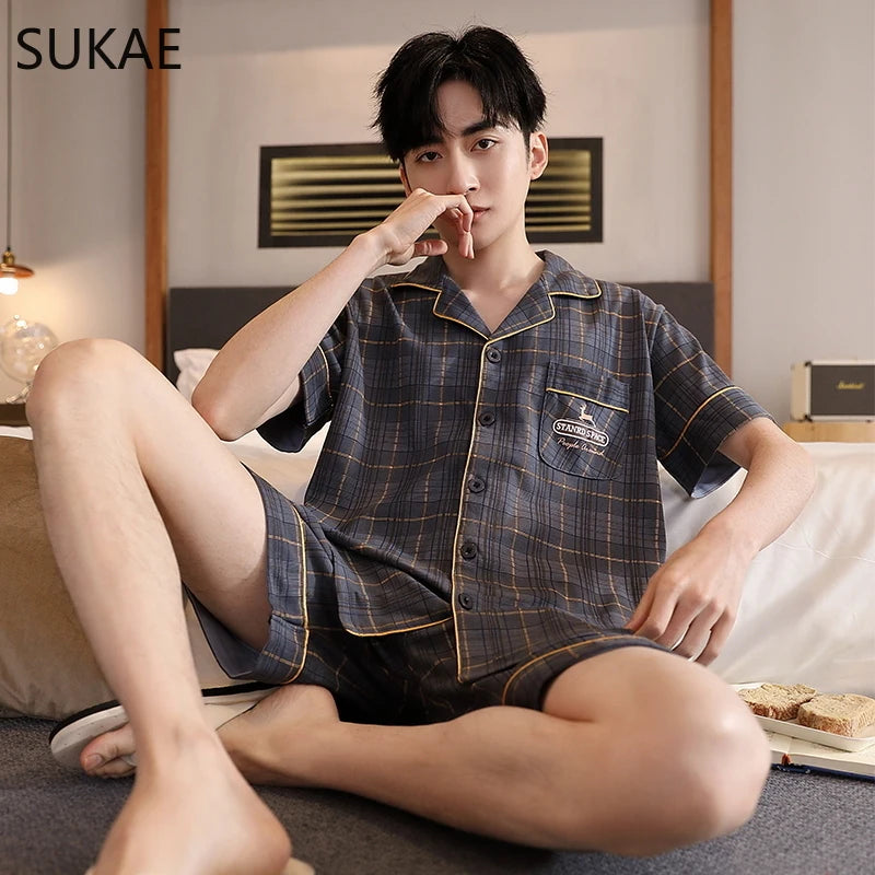 SUKAE Plaid Pyjamas Men Cardigan Lapeled Gentleman's Home Wear Summer Shorts Cotton Lounge Wear Plus Size L-5XL Pyjama Sleepwear