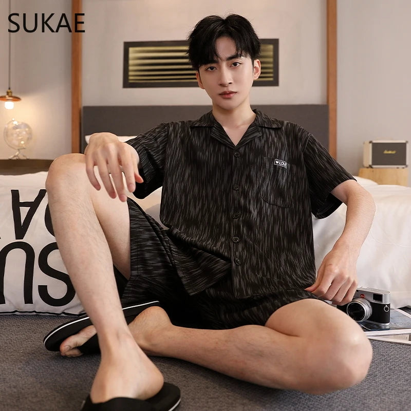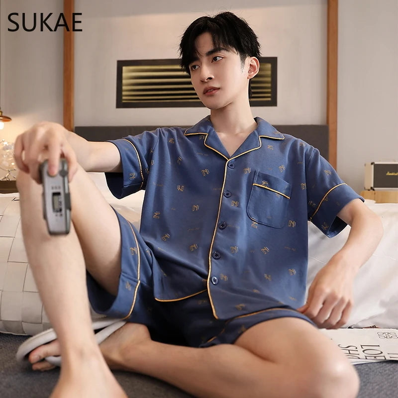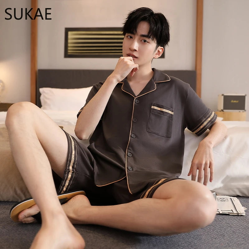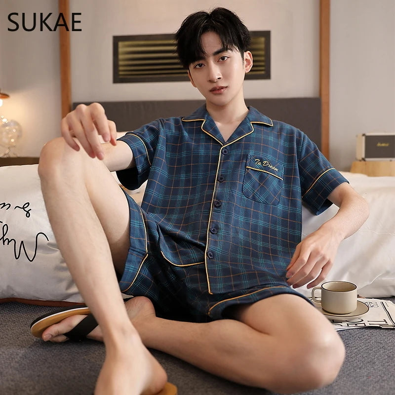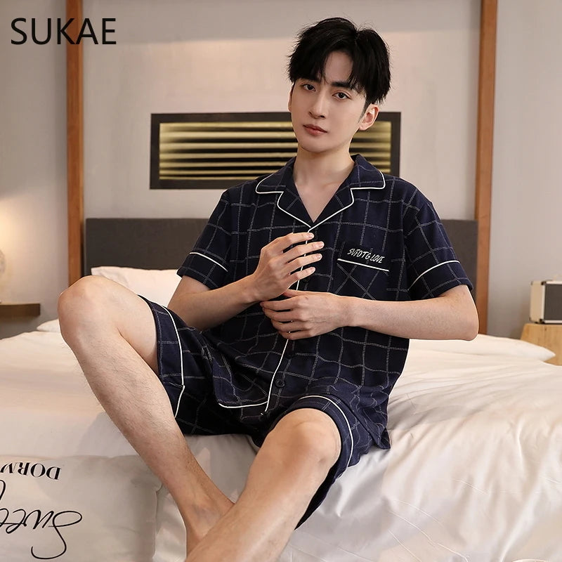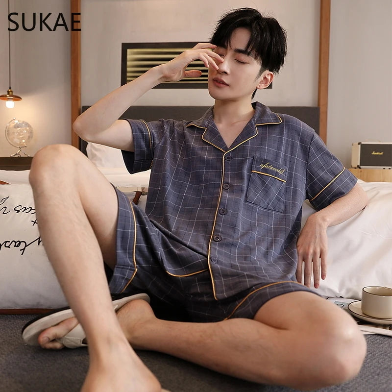 SUKAE Plaid Pyjamas Men Cardigan Lapeled Gentleman's Home Wear Summer Shorts Cotton Lounge Wear Plus Size L-5XL Pyjama Sleepwear
