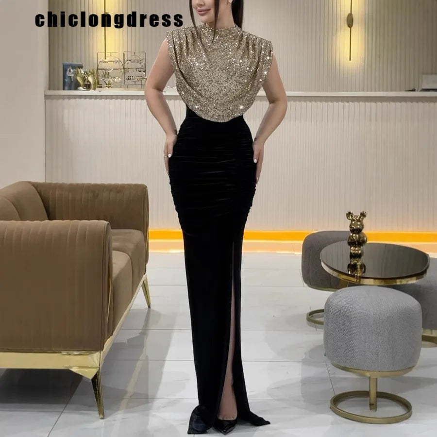 Winter Sexy Sequin Slit Evening Dress Women Fashiona Round Neck Sleeveless Sequin High Waisted Slit Christmas Party Dress Women