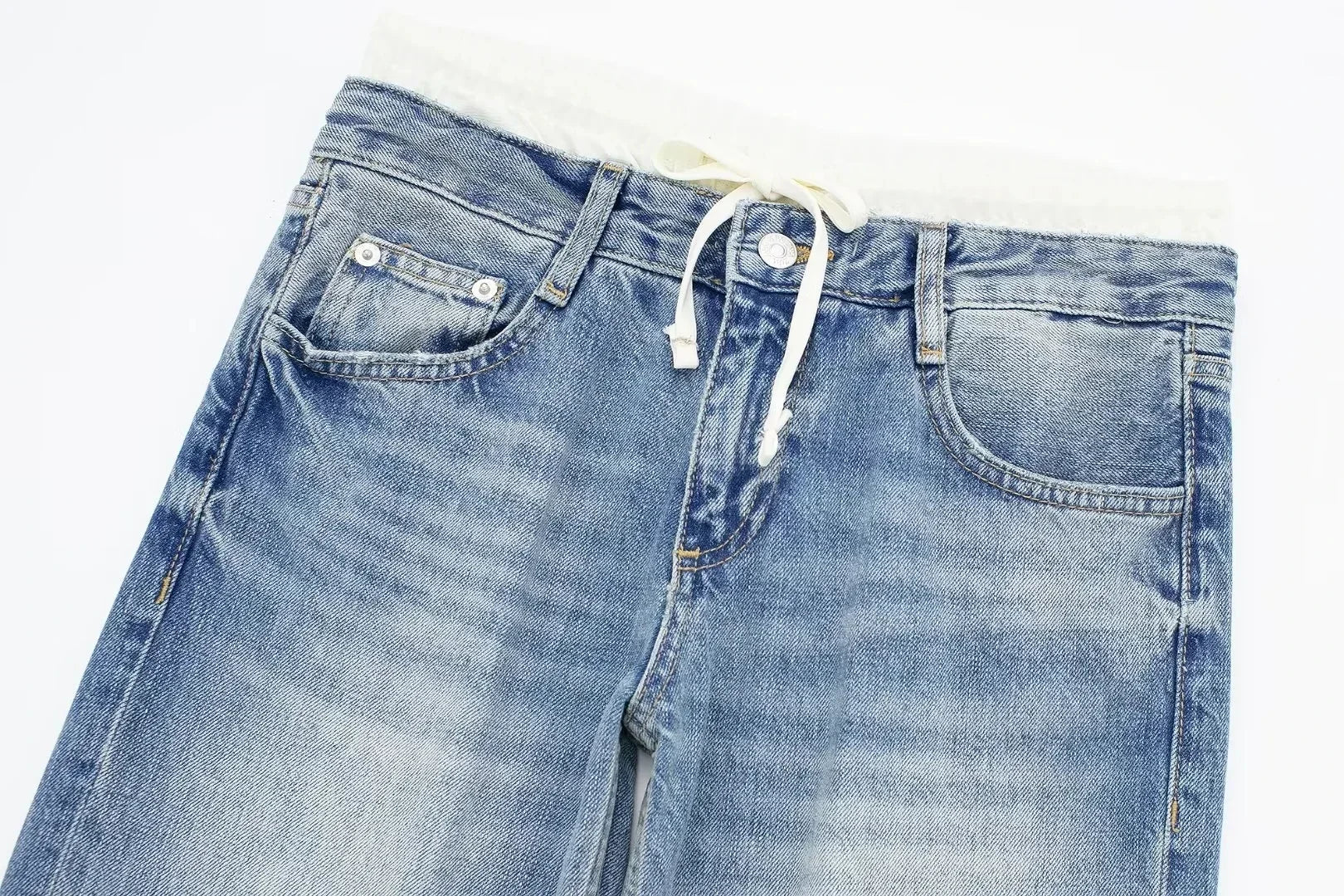 Women Fashion Patchwork Denim Pants Lace Up Zipper Fly Jeans Trousers Pockets Female Casual Mid Waist Straight Leg Pants