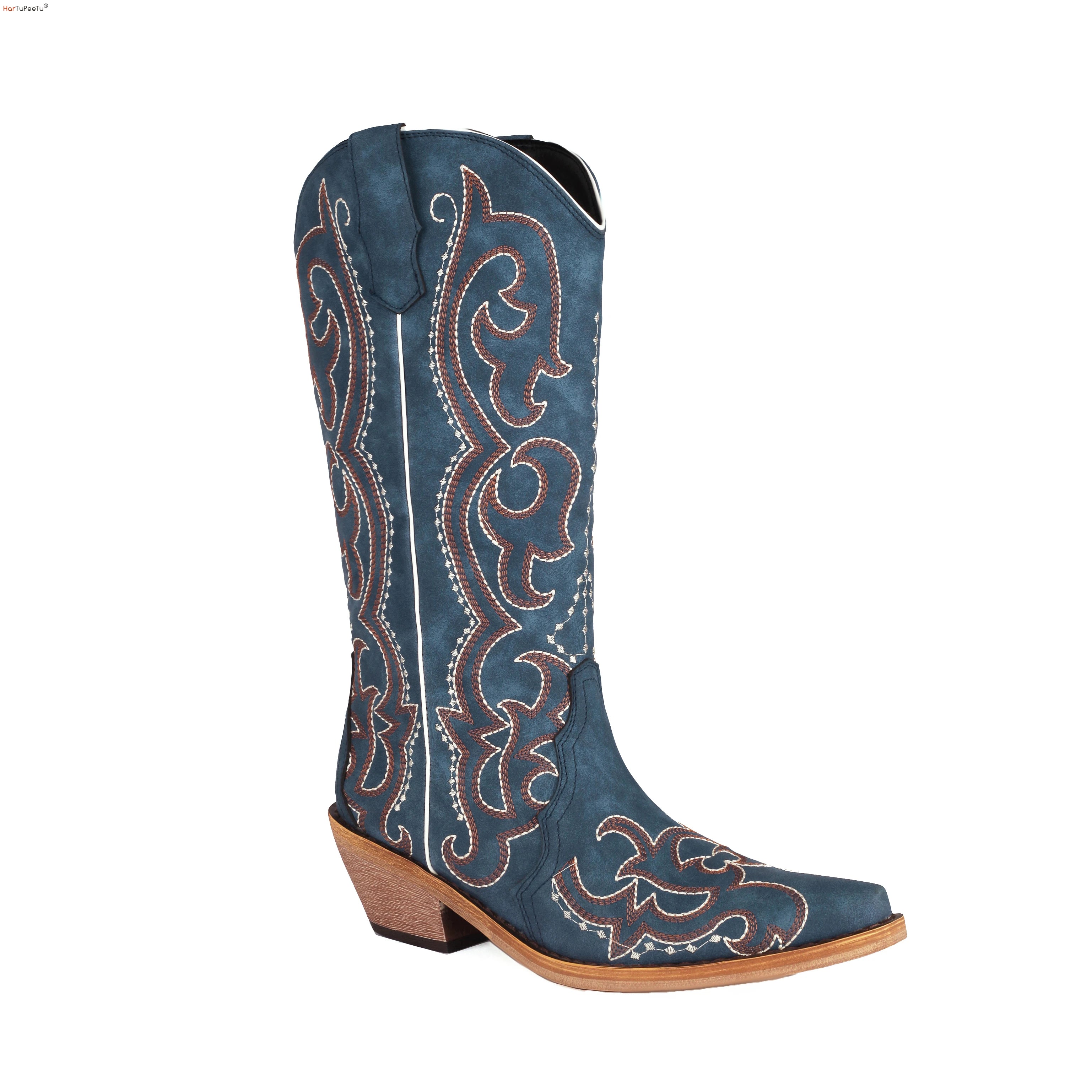 Women's Cowgirl Boots Blue Comfortable Cowboy Western Boots Wide Calf Leather Embroidery Dapper Shoes